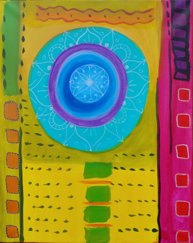 This canvas starts out with loosely symmetrical geometric shapes and then magically moves into a mandala made with white paint marker on top. This combined with the vivid colors makes the painting almost look like it is from Mexico or perhaps India, especially the saffron sunny tones in the background. Drawing mandalas is a whole lot of fun and super easy. I will need to write more about these.