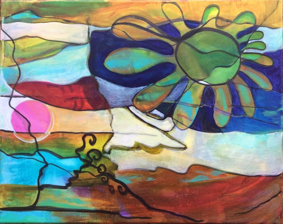 Starting out with a landscape created in stratas of desaturated colors layer after layer changes the painting, using brighter colors (higher saturation). As it moves along, symbols and imagery from distant pasts and possible futures populate the painting.